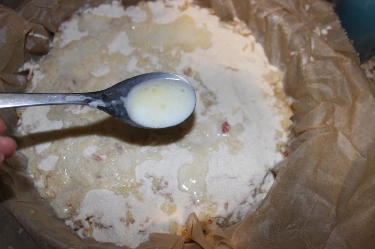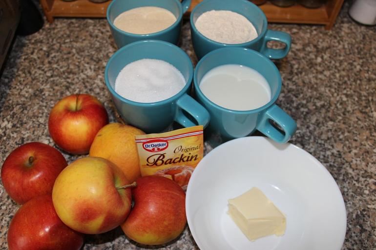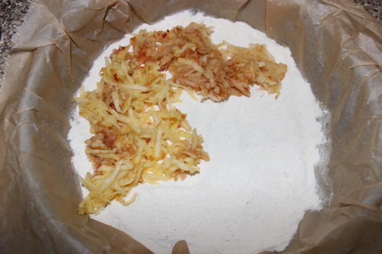 Сыпучие ингридиенты я разделила на 3 части, яблоки на две части.