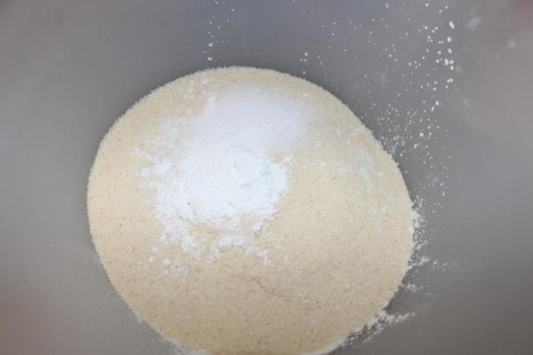 Смешиваем все сухие ингридиенты: Сахар, Муку, манку, разрыхлитель, ванильный сахар или корицу.