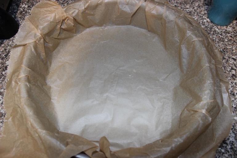 Разъемную форму застелаем пергаметной бумагой. Чем меньше форма тем больше будет слоёв.