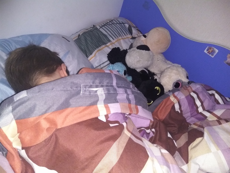 Что меня удивляет и радует, что мальчик всех сперва спать укладывает, что-то им рассказывает, а потом только сам... не кинет никого,не забудет.... такой заботливый папочка растёт!))))