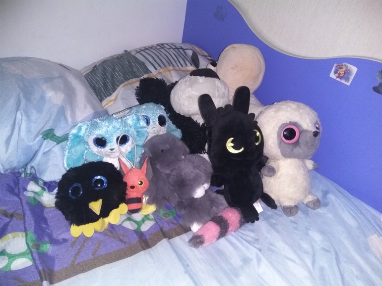 Вот так))) вся эта братия вечером выкладывается в кровать. У каждого есть имя и характер. Енот юху, баловник, любитель планшета (невидимого) и задира. Синие зайцы - Профессионал 1 и 2 на манер криперов тз майнкрафта. Цыпленок цыпа. Бараненок. Ботаник и любит учиться)))) Красный кто то - малыш, лялечка с соской, тоже не видимой. Собаку и серого зайца забыла, как то сложно зовут)))) Безубик новенький, ему надо все показать, не обижать, сводить в сад и тд ....