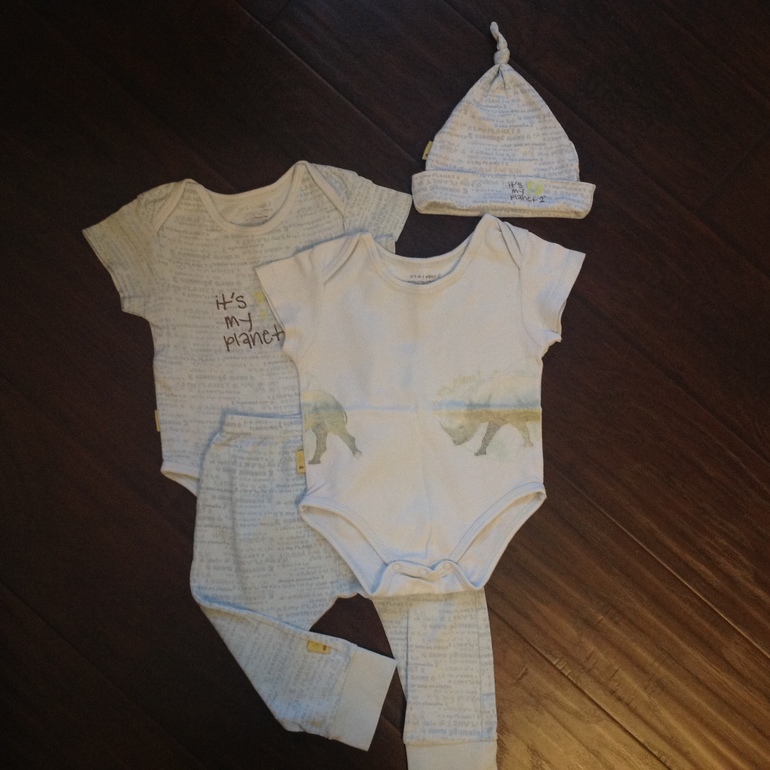 Из органического хлопка. В хорошем состоянии. На боди с бегемотами есть малозаметные пятна.