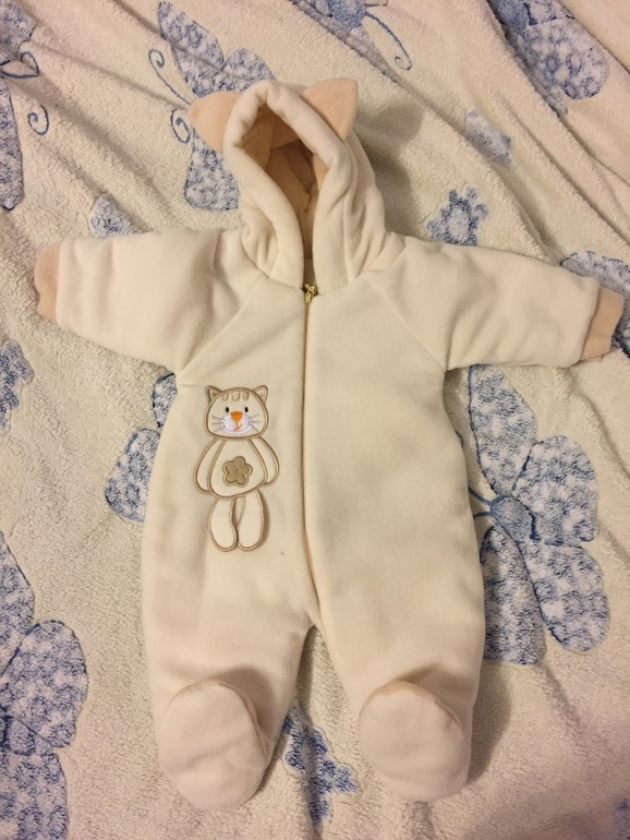 Комбез 62 размер. Думала взять 68, но он уж очень больше, не нашла бы я свою зефирку в нем. В нем можно и весной гулять. Утеплённый синтепоном. Фирма Babyglory. Там были ещё зайчик🐰 и мишка🐻. Но котёнок🐱 мне милее ))