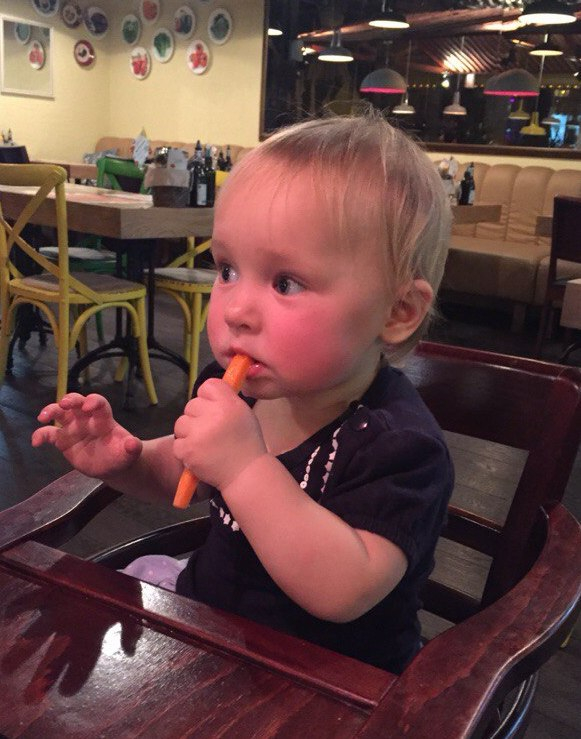 Еще я попробовала дать Полине ложку, чтоб она сама поела каши. Первая ложка попала в рот (хоть и кривовато), вторая тоже куда-то туда, третью же она размазала по своей голове. Заказала на Али фартуки для еды с рукавами, буду Полину обматывать и пусть так ест.