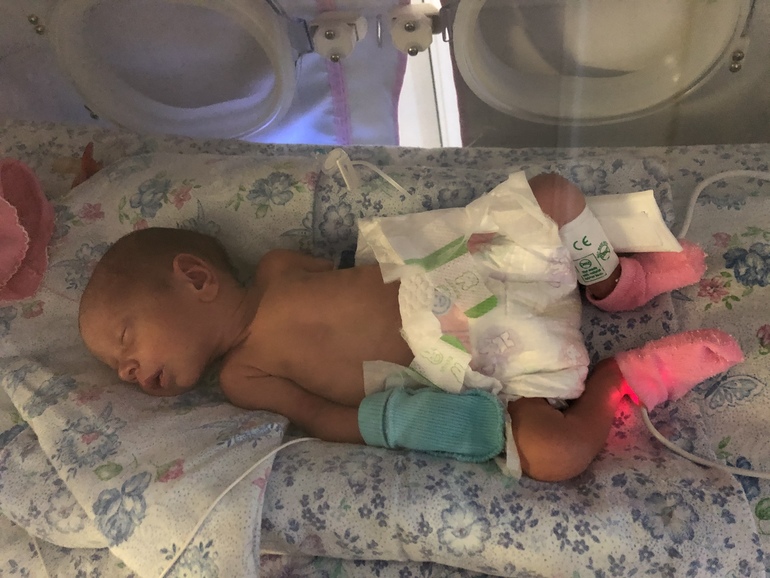 Дюймовочка наша крошечная, сразу после рождения была переведена в реанимацию где ровно 5 дней пролежала без меня в кювезе закрытом, дышала сама, кормили то через зонд то из бутылки, но бутылочкой тяжело было кормить так как ротик крохотный и сил нет, зонд удобнее- залил и спокойный малышок! Девочка спокойная очень! Самая крошечная была в отделении! Фото не передаёт ее крошечности, на фото кажется обычная малышка, а она ростом была с две ладошки, помещалась потому что!