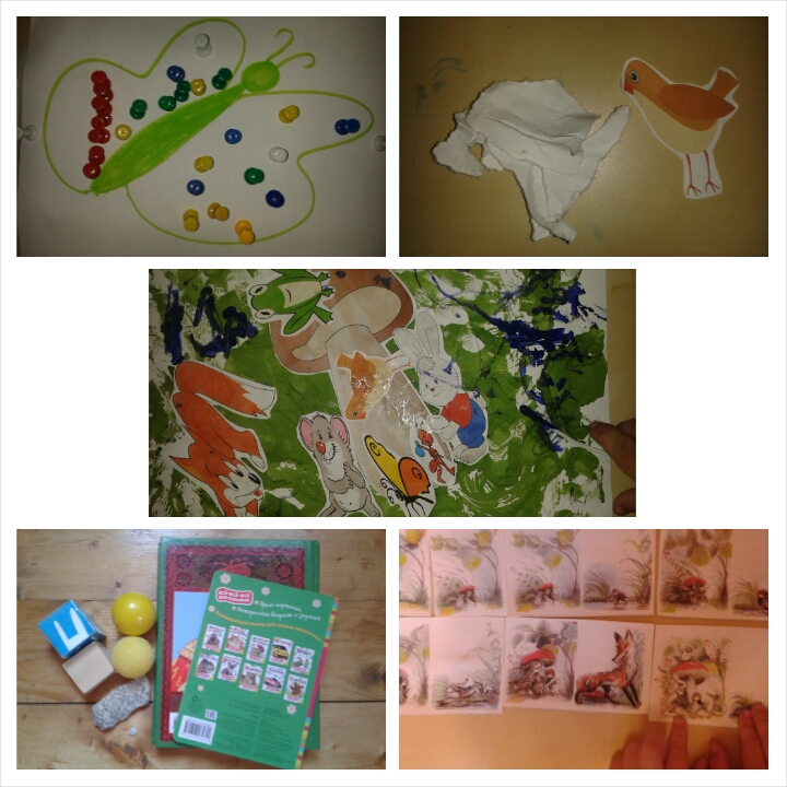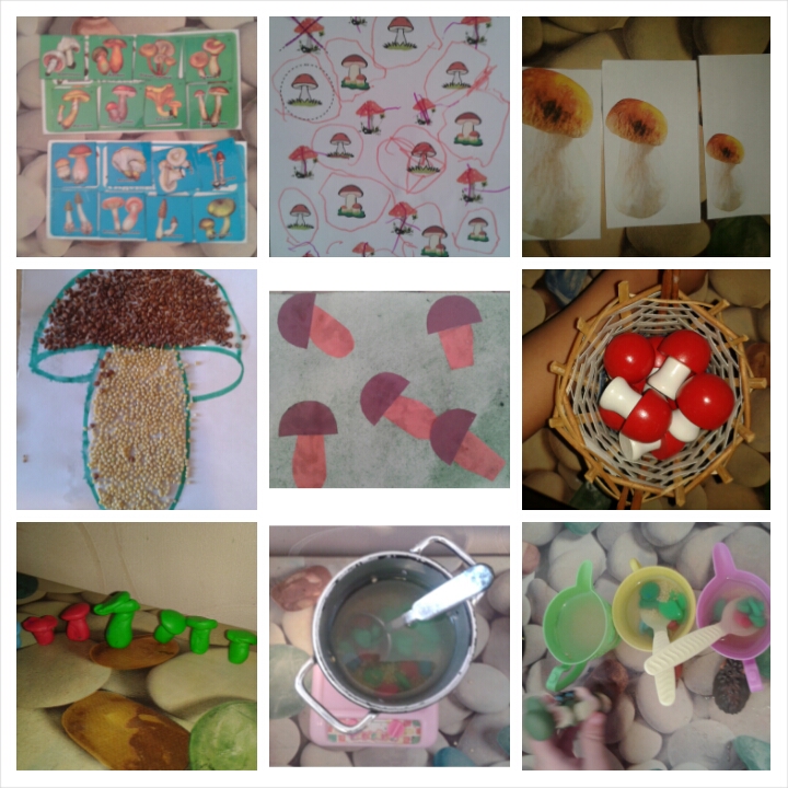 Кроме этого мы сделала аппликацию крупами ( в 2 захода из-за ожидания пока высохнет клей), аппликацию грибочки (ножки и шляпки) на ayt самопокрашенной лужайки. Нашли все съедобные грибы на картинки и даже зачеркнули мухоморы, пальчиковую гимнастику и собрали 2 карточки лото со съедобными грибами.