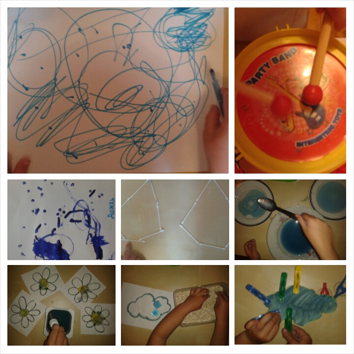 - рисовали дождь фломастером (сам попросил), а потом еще один ватными палочками (на втором нет туч, потому что это такой "особенный дождик" сказал Грибочек)