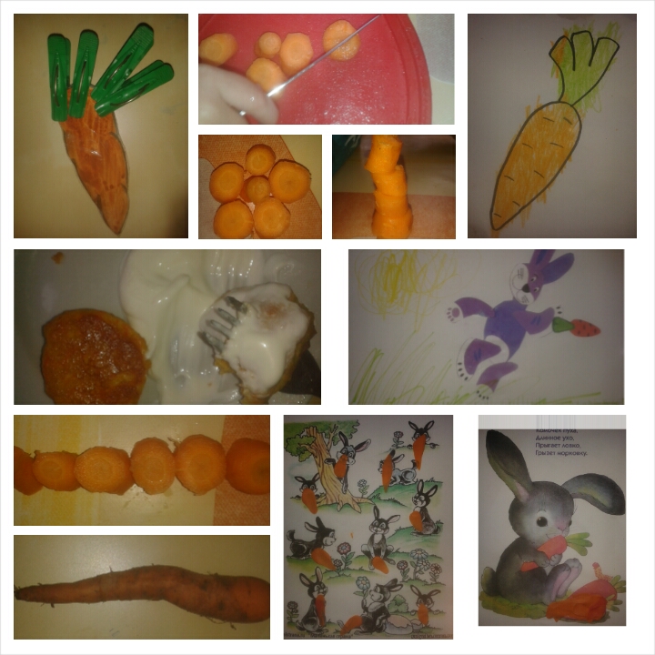 Дальше хвостики морковки из прищепок, пластилинография, сделали каждому заяке по морковке, раскраска и аппликация (с лапами беда - деть их клеил по своему усмотрению, травку рисовали вместе). тем временем все было готово для финального этапа. Поставили готовиться и ушли читать Карлхена)) Морковная тема продолжалась.