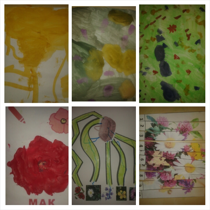 - рисовали луг (красками и кисточкой (я немного для вида помогала)) а затем на сухом уже лугу цветы (в основном тычками, но синие пятна со слов ре - васильки)