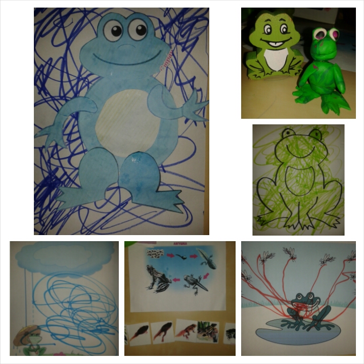 Кроме того, мы раскрашивали лягушку фломастером, рисовали болото и делали на нем аппликацию, а также я лепила лягушку, пока деть мял и резал пластилин.