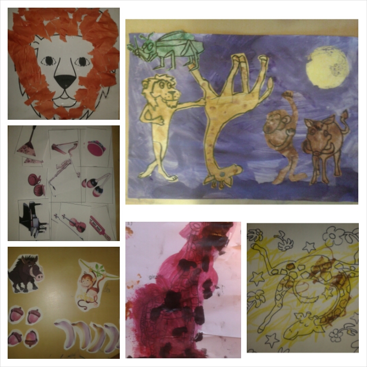 Кроме того, было творчество: льву делали гриву из бумажек (предварительно сами порвали), раскрашивал зверей из книги, а потом мы нарисовали фон (ночь) и приклеили высохшие раскраски (мне оч. нравится такой многоуровневый формат творчества)