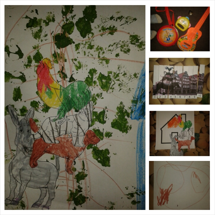 Ну и в довершение нашли все музыкальные инструменты, на которых в нашей версии сказки играли Осел, Пес, Кот и даже Петух. Ну и смузицировали. Наш собак очень ценит такие концерты и разве что лапами уши не закрывает)) Но деть музыкальные инструменты любит, так что концерт был длинным и в ход пошли все остальные инструменты)