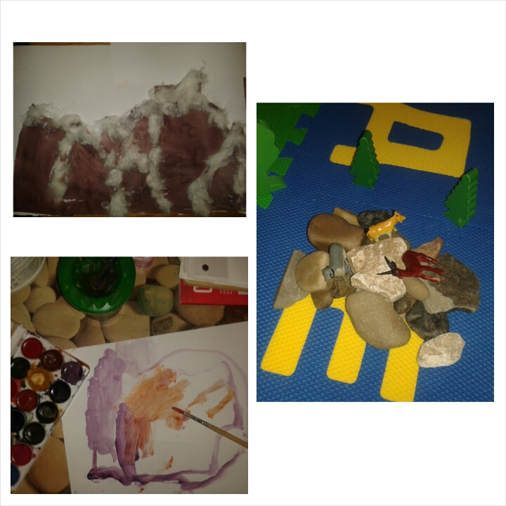 Еще днем неожиданно деть вытащил наш мешочек с камнями и возил их туда-сюда, так что мы обсудили, что горы из камня, обсудили цвета камней, построили несколько гор. После заселили гору козлами и баранами, увезли на пик принцессу и спасали пару раз)) Потом принцу надоело))