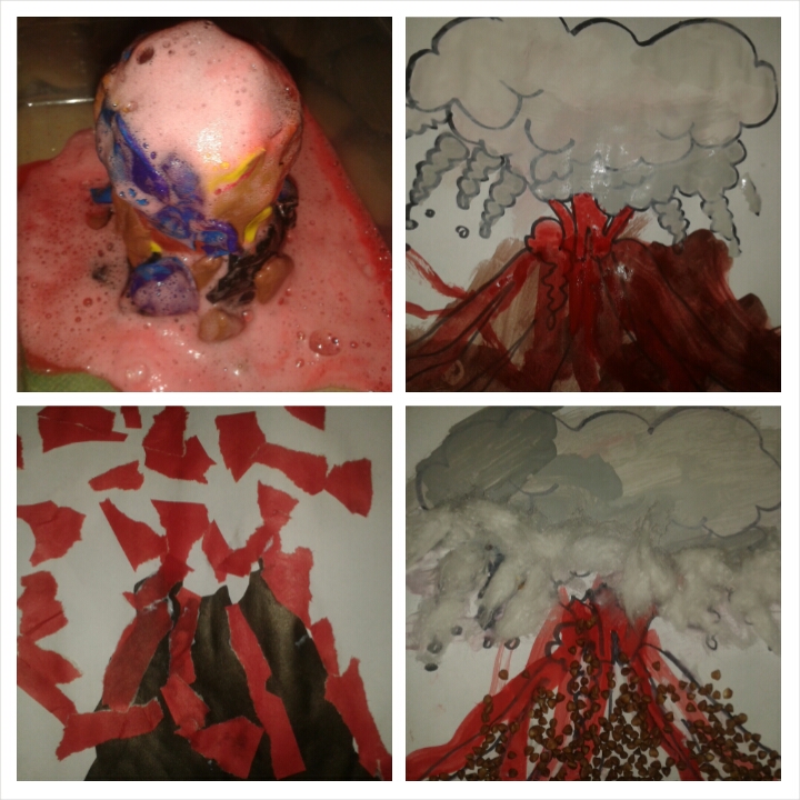 Дальше был вулкан и брызги из кратера (аппликация. с нарисовала и вырезала вулкан, деть нарвал кусочки лавы из красной бумаги, потом все это наклеили.