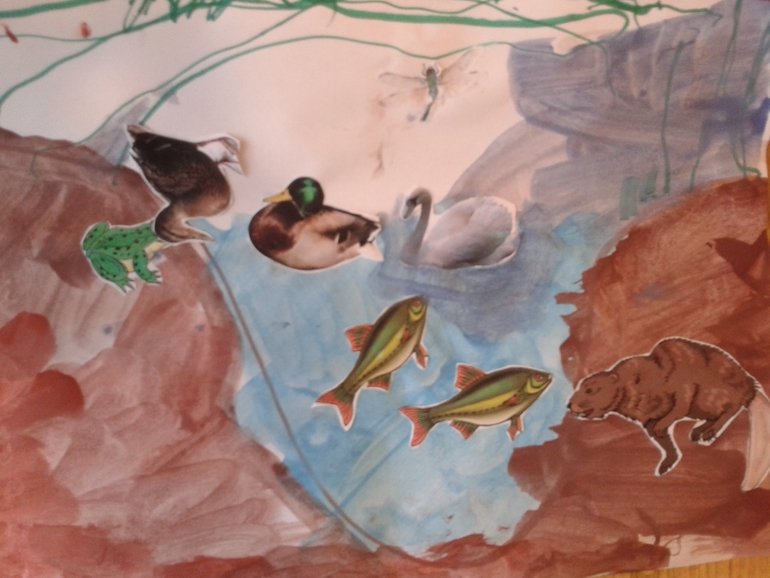 Читали сказку про овраг и сделали творческое задание. Я рисовала что где, а деть раскрашивал и клеил.