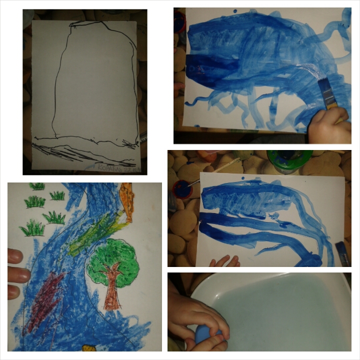 Потом мы взяли кисти разной ширины и рисовали полноводные и не очень реки. Дальше речки все превратились в море рукой Грибочка. Реки, впадающие в море пришлось рисовать заново)) Зато стало очень понятно, что куда втекает, я надеюсь))