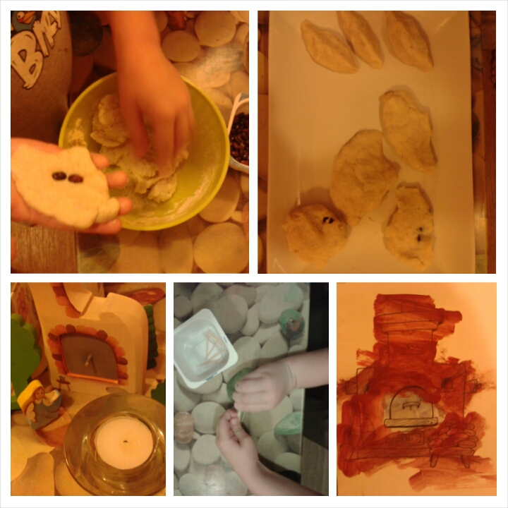 Печка: Сделали дорожку из мозаики по лесу, сделали почти вместе соленое тесто, лепили пирожки, начинка из фасолек, поставили пирожки в духовку, раздували огонь - тушили свечку, ломали лучинки - зубочистки (задание оказалось крайне сложным, они не ломались, надо в разные стороны гнуть, было видно, что Грибочку уже надоело, но мы все доделали, раскрашивали печку)