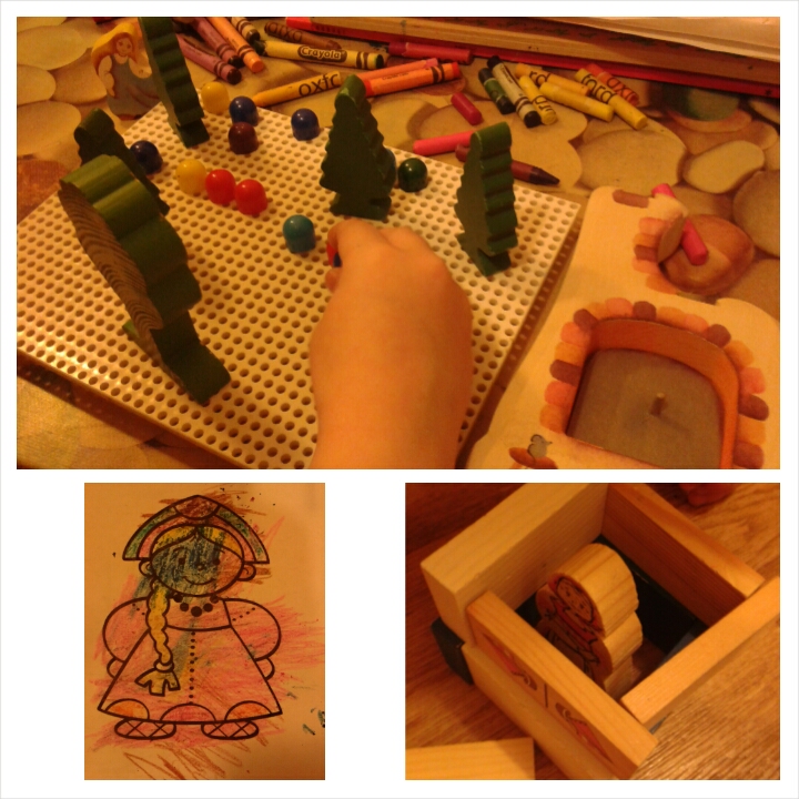 Дальше дооолго раскрашивали дочку. она у нас красотка с синим лицом)) Потом уже превратилась дочка в деревянную фигурку, гуси-лебеди унесли братца и девочка пошла его искать.