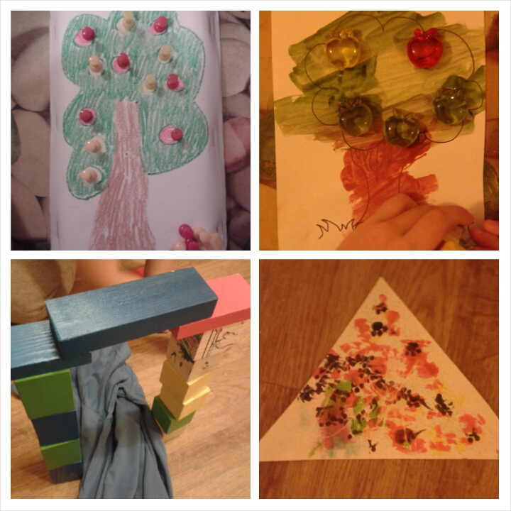 Яблоня: раскрашивали яблоню, в самом конце этой части в нужные места разложили яблоки из фикспрайса, вставляли яблочки - силовые кнопки по цветам на яблоню, обводили только красные яблоки на дорожке, считали (вместе), искали, на какой яблоне больше яблок