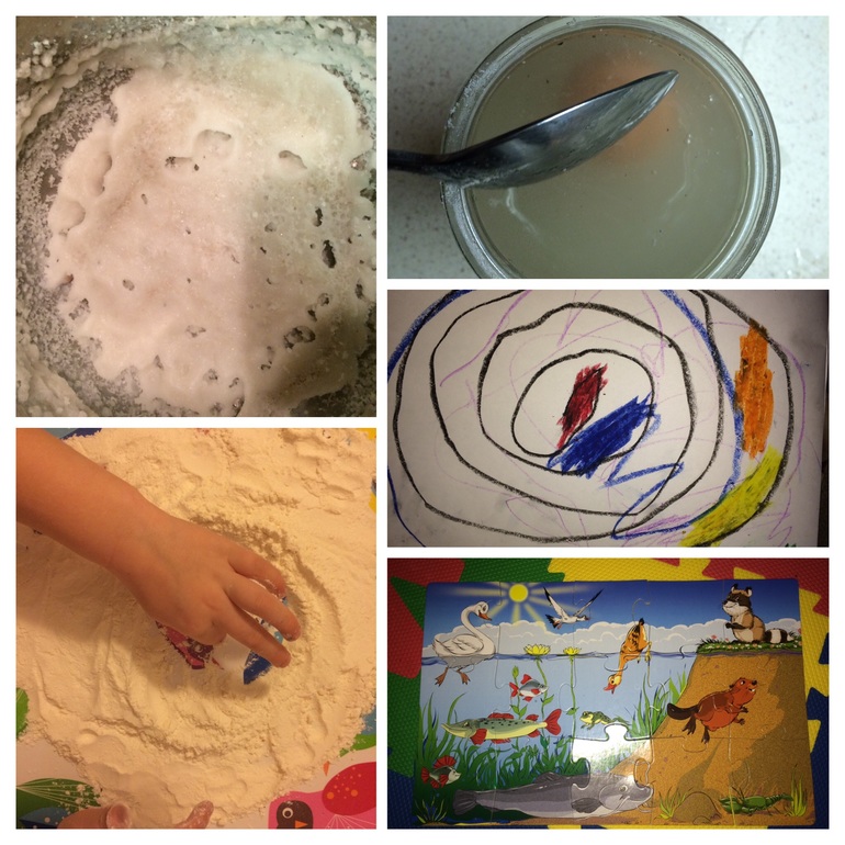 Разбирались, что озера могут быт пресные и соленые. Долго экспериментировали с яйцами. Мы летом уже делали такое и не особо заинтересовало. А тут видимо дорос)) Вообщем полпачки соли и очень заняты ребенок) делали и в 2х банках и в общую сливали. Мне оч. понравилось, когда яйцо как бы посередине зависло. Но деть не особо оценил и досыпал соли пока оно не всплыло пальчиком его пальчиком, чтобы прыгало в воде))