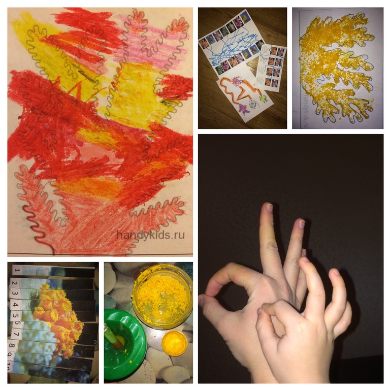 Потом отобрали восковые мелки цветов благородного коралла + желтый. Обсудили, какой он коралловый цвет и стали раскрашивать коралл. Я внизу. деть сверху) Ну видно где кто