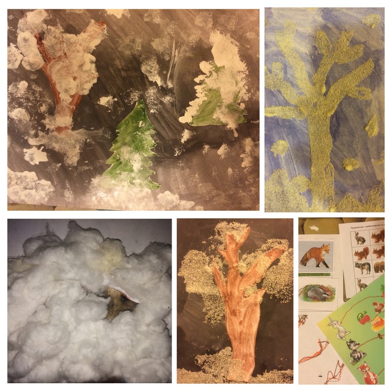 Пока деть тонировал листы. я нарисовала типа стволы деревьев и елочки. вырезала. Мы наклеили их на тонированный лист. получился лес и ре маленьким кусочком губки штамповал снег. Имхо. вышло очень красиво.