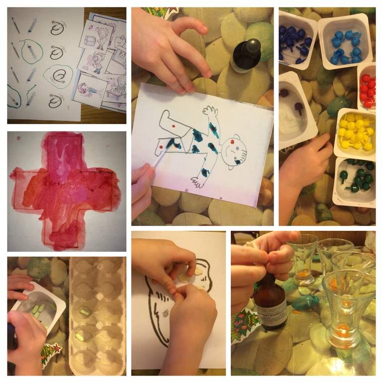 Днем сделали часть за столом - логика немножко, мазали зеленкой ранки ранки мальчику, клеили пломбы на зуб как стоматологи, раскрашивали красный крест красками и доктора, сортировали пилюли - фишки мозаики, наливали микстуру (подкрашенную воду) пипеткой по стаканчикам для больных, раскладывали таблетки по ячейкам с помощью пинцетом.