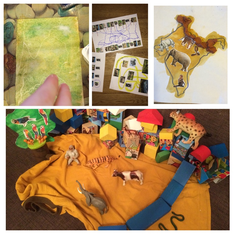Еще мы сделали инсталляцию. Из кубиков горы, из синих плашек Ганг. Животные в большинстве своем нашлись в коробке. Только рысь изображала снежного барса, а бурый медведь гималайского. Вспомнили что большинство животных есть у нас в зоопарке. Из инсталляции деть еще поиграл в разломанные горы, покрытые песком и потерянных животных)