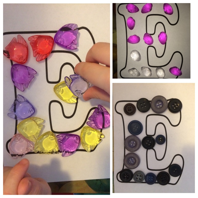 Мы выкладывали букву из пуговиц, ракушек и рыбок