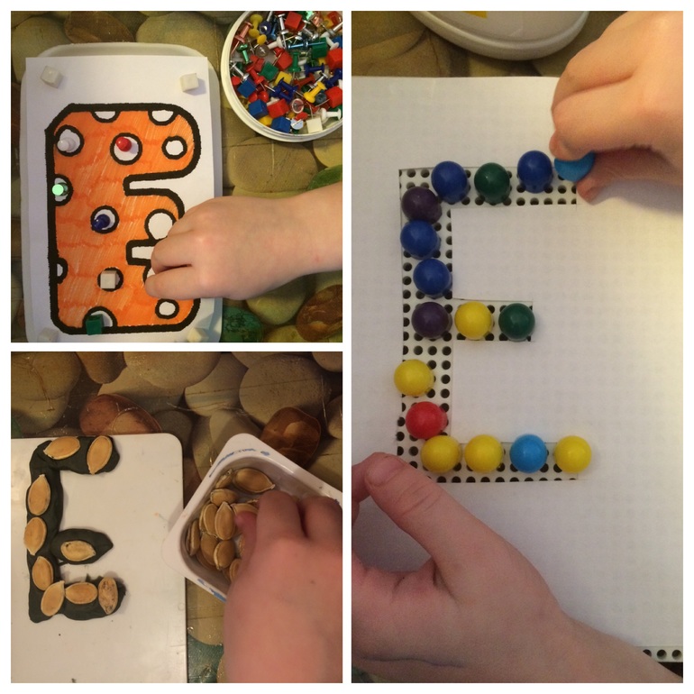 Кроме того налепили букву Е из пластилина и украсили тыквенными семечками