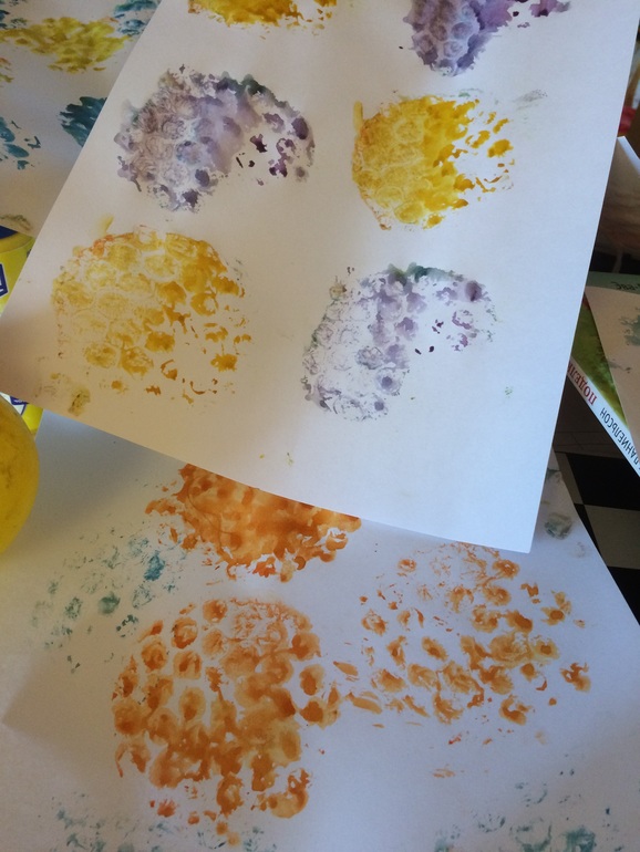 - штамповали пупырчатой пленкой (ре надолго не хватило, потом он перешел к самостоятельному рисованию на листах) после высыхания мы сделали из этого всего гирлянду бабушке (моей маме) на ДР