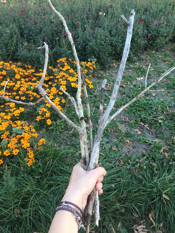 На улице нашли сначала одну палку, потом еще и еще... В итоге вышел целый букет из палок. Мы с грибочком решили, что он похож на оленя.вот смотрите