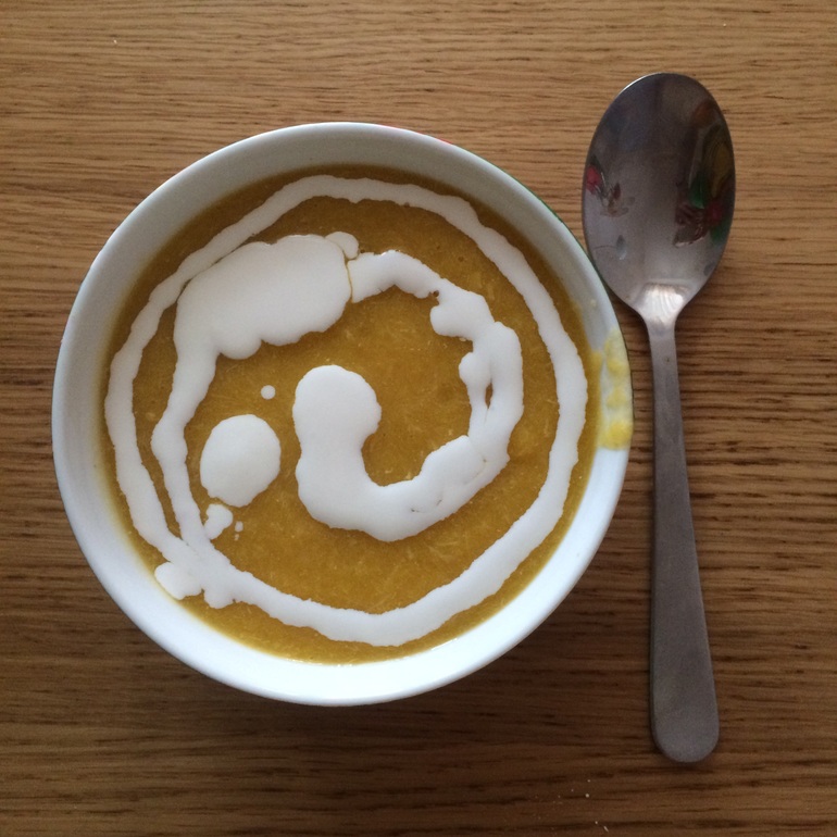 Итак, сначала часть практическая Тыкву рассмотрели, деть помыл, потом чистил семечки, резал и в итоге мы сварили суп вот по этому рецепту. Вышло вкусно:)