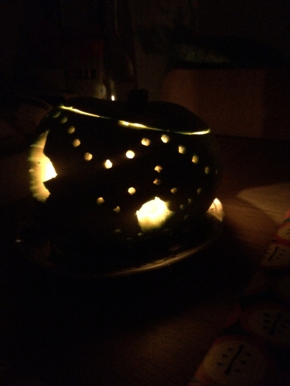 А вечером из оставшейся полой тыквы мы (точнее я) сделали фонарик с помощью отвертки:)) Я к сожалению не мастер вырезать ножом, так что сначала дырявила отверткой а потом соединяла ножом, если нужно в итоге у нас получилось вполне симпатично. Мы вырезали на боках осенние листочки (березовый, дубовый) солнышко и дождик. То, что характерно для осени:)