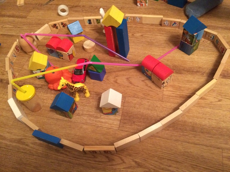 ну и в довершение мы с Грибочком успели построить городок, обсудить про реку и воду, про систему водопровода, а вот сделать нам с ним не получилось. Малышка пришла помогать разбирать город