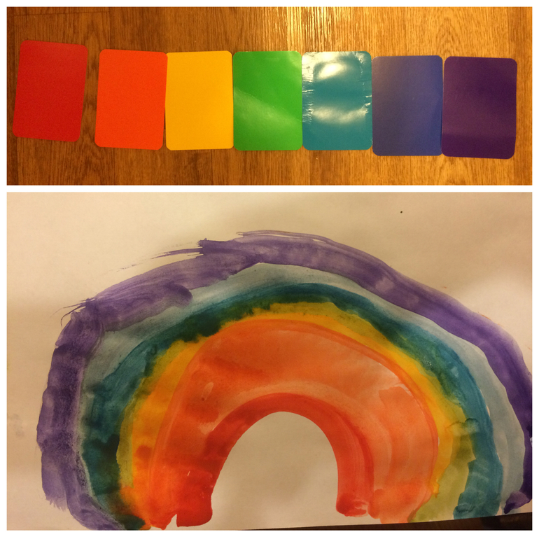 Теперь радуга. Научила сына про каждый охотник желает знать где сидит фазан. Разбирались с какой буквы начинается каждое слово и какой цвет есть на эту букву. Дальше достали карточки от умницы и выбрали нужные цвета - разложили. После ре по цветам нарисовал радугу сам. я рисовала красный полукруг, дальше - ребенкино. Красиво!