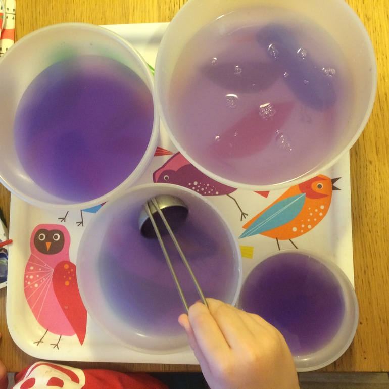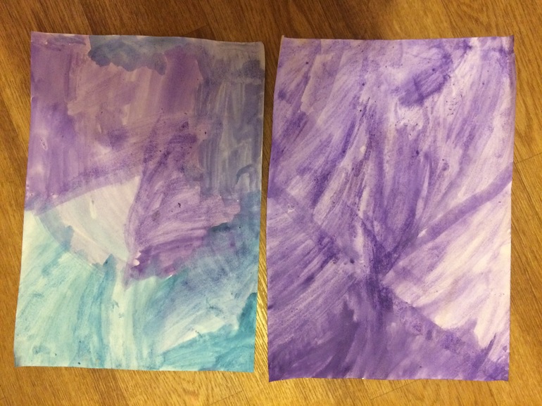 Дальше налила ре воды в плошки, обозначили, где озеро-река-море-океан. Он сначала ее красил, потом переливал.