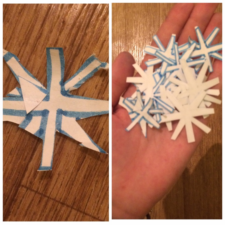 Дальше снег - вырезали снежинки (очень мелкие я нарисовала. снежинка еле выжила мы ее заклеили в одном месте:) потом дули на снежинки и устраивали буран, который как раз начался когда мы возвращались с прогулки