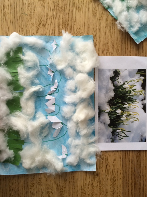 Потом клеим снег на подснежники. Как обычно вата вызывает отдельный тактильный восторг.