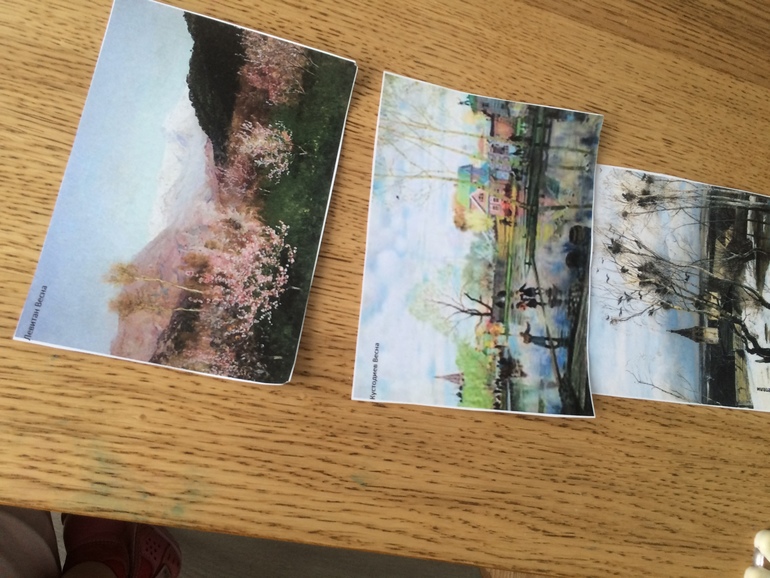 Теперь рассматриваем картины. Я распечатала Грачи прилетели Саврасов, Весну Кустодиева и Весну Левитана Грибочек такое не любит. Тут надо рядом сидеть и обсуждать, а Малышка тоже не оценила и стала сбегать от нас в другую комнату безобразничать:))