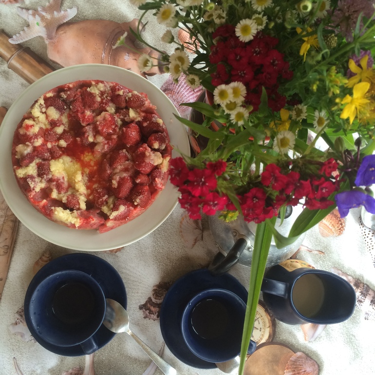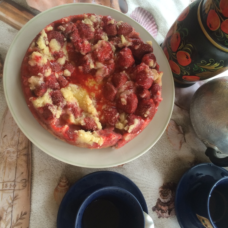 5. достать бисквит из духовки, выложить сверху ягоды и посыпать крошкой из масла муки и сахара. Поставить в духовку еще на 20 минут при той же температуре.