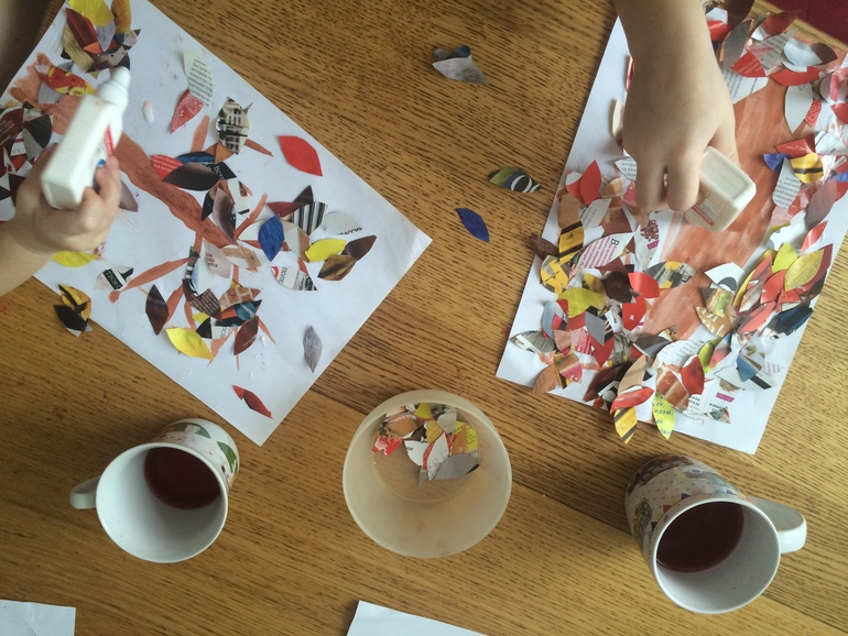 4. Осеннее дерево Аппликация. Мы в этом году столько уже этих деревьев наделалли, что это с листочками из журнальных страниц. Грибочек все делал сам. Малышке я рисовала дерево пока она рисовала на своем листе очередной шторм:) а клеила она сама. Как брат:)