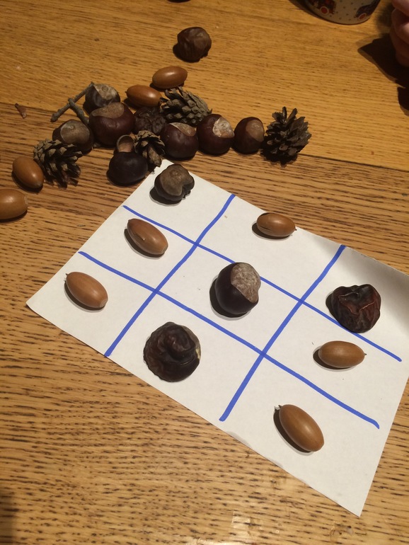 крестики-нолики из подручных средств. у нас были желуди и каштаны. Выиграли по разу и Грибочек, и папа, и я. Прогресс - Грибочек сумел обыграть папу. обычно бывает ничья.
