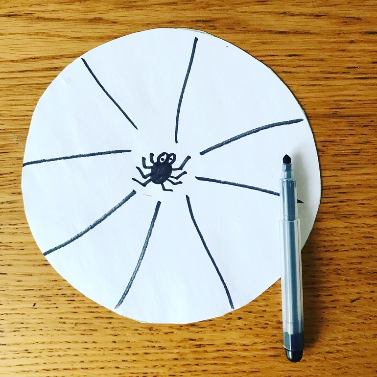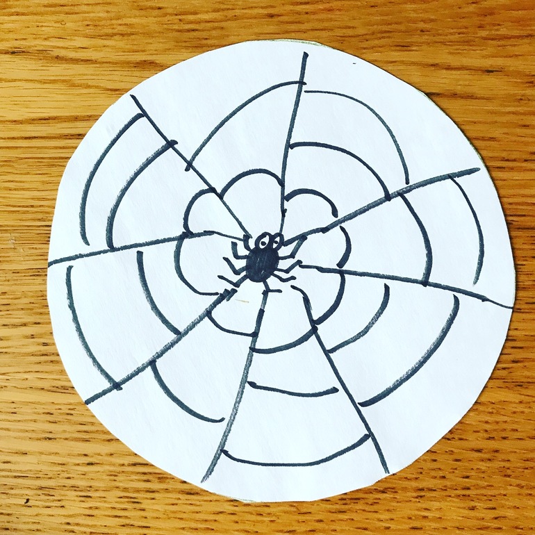 -рисуем паучка в центре бумажного круга. Далее вокруг рисуем паутину фломастером