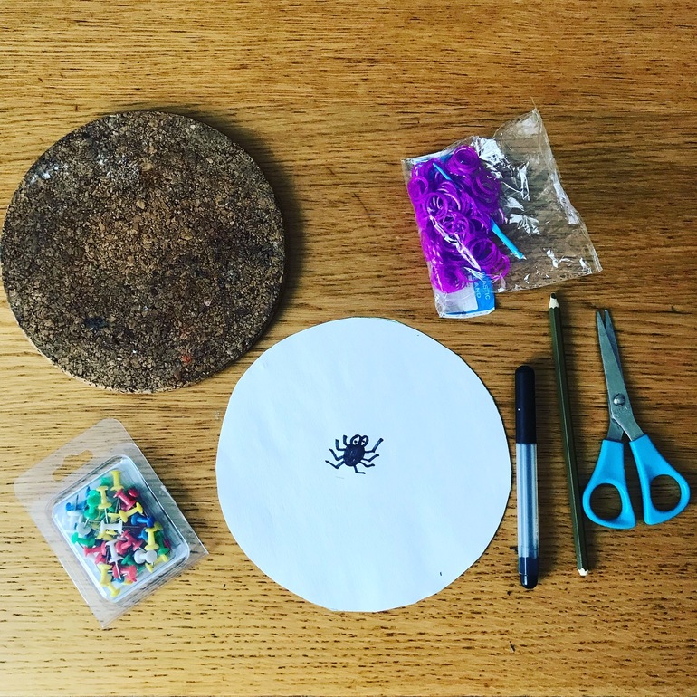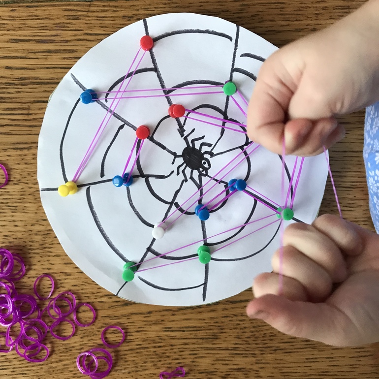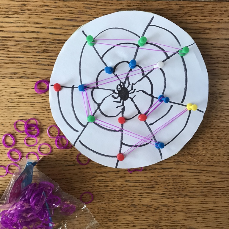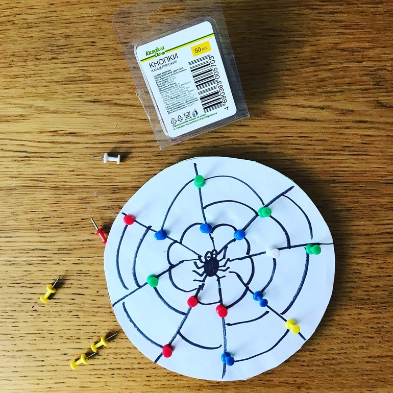 Предлагаем детям помочь сплести паучку паутину путем натягивания резиночек на кнопки.