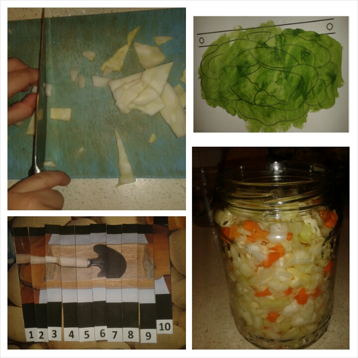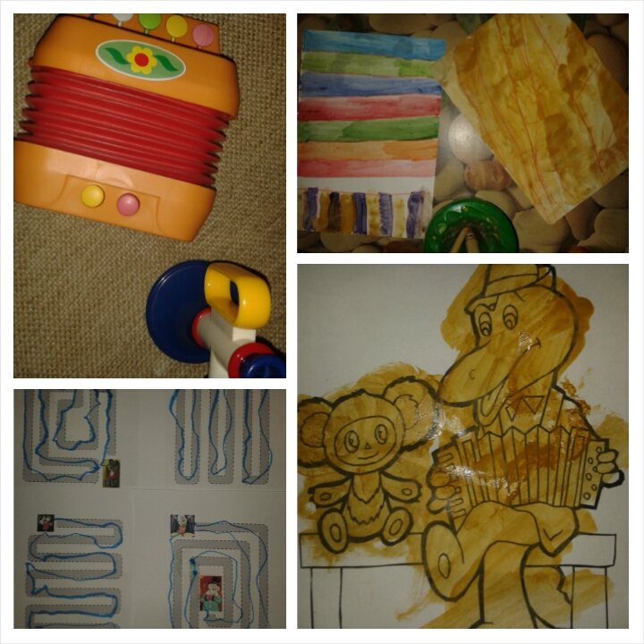 Печка: Сделали дорожку из мозаики по лесу, сделали почти вместе соленое тесто, лепили пирожки, начинка из фасолек, поставили пирожки в духовку, раздували огонь - тушили свечку, ломали лучинки - зубочистки (задание оказалось крайне сложным, они не ломались, надо в разные стороны гнуть, было видно, что Грибочку уже надоело, но мы все доделали, раскрашивали печку)