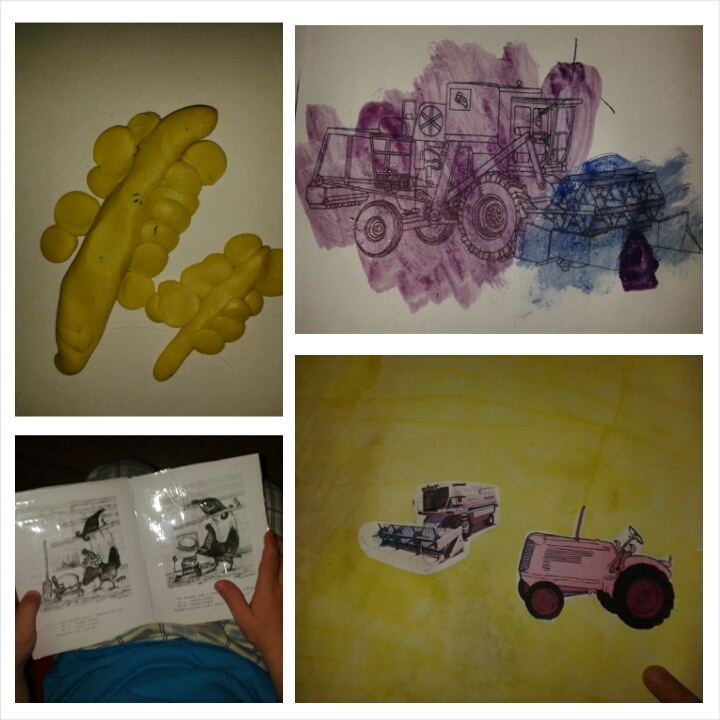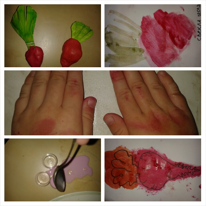 Порисовали. Когда рисовали пастелью, я говорила Грибочку, что сначала раскрашивать, а что потом. а красками он уже сам сделал по аналоги, хотя я ожидала полностью зеленый рисунок)))