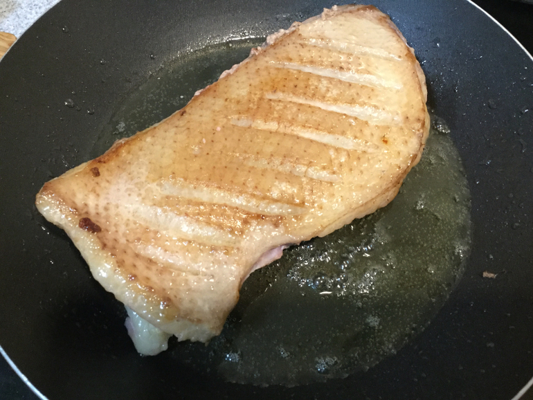 На разогретую СУХУЮ сковороду кожей вниз. Без соли и прочих радостей. Огонь на минимум. 20 минут, чтобы вытопился жир.