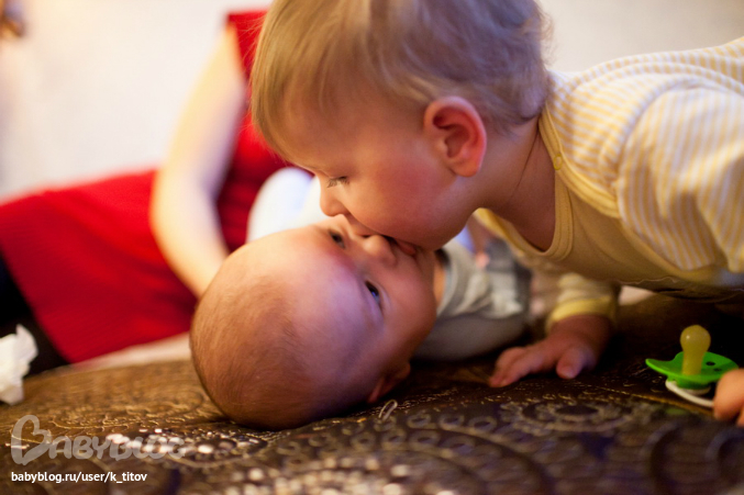 Прям мои дети)Это когда временно-мило)))А когда все время старший целует младшего,начинаются крики,надоедает маленькому.