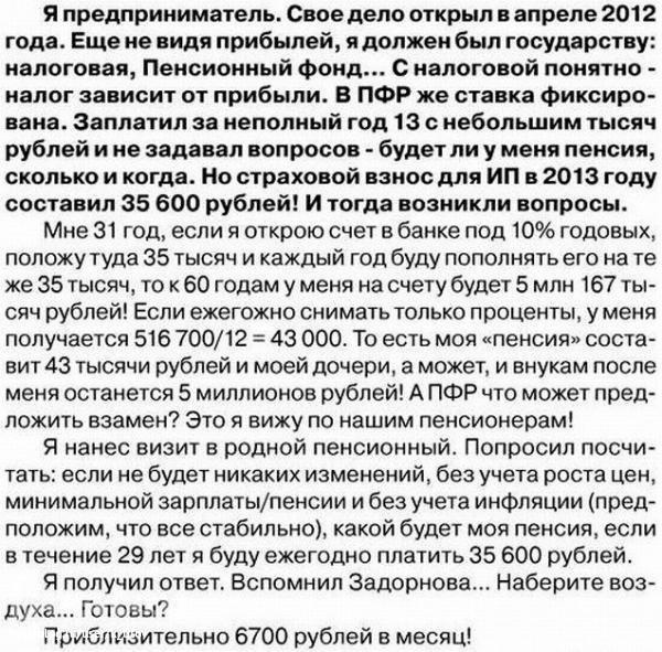 когда нынешние молодые предприниматели пойдут на пенсию, их будет кормить младшее поколение. с учетом того, с какой скоростью сокращается население страны, можно представить, какие будут налоги (или какая будет пенсия). про счет в банке мы думали, но за 25-30 лет все может так поменятся, что (на выбор:) не будет банка, не будет страны, не будет вкладов, не будет пенсии (выплат), не будет пенсии (будем работать пока можем), детей обяжут содержать их родителей и т.д.